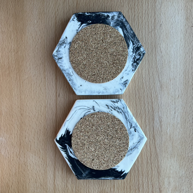 Marbled off white and black hexagons. Ideal to use as coasters, or as a trinket tray to pop your jewellery or loose change in.