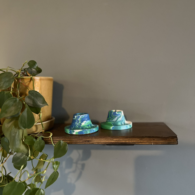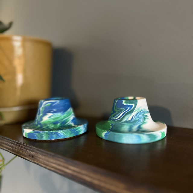 Blue and green curved candlestick. Pictured with matching tall candlestick.