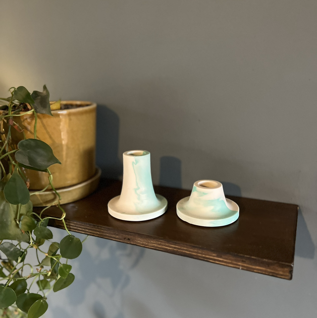 Mint green curved candlestick. Pictured with matching short candlestick.