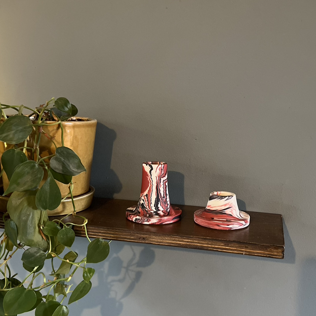 Dark blue and dark red marbled with white in a curved candlestick. Pictured with matching short candlestick.