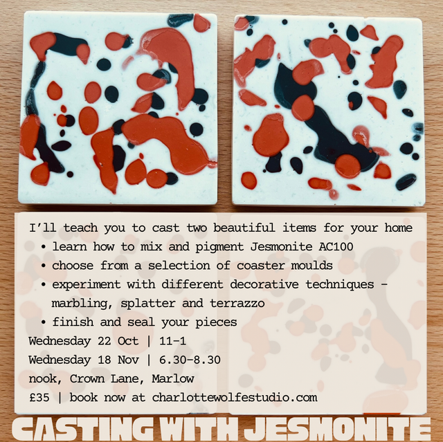 Jesmonite is an extremely versatile non-toxic resin that sets to a stone-like finish. Your piece can set in as little as 30 minutes, meaning we plan well, work fast and get to experience the whole process from design to the finishing touches within a two hour workshop. You could make a matching set or try out two different techniques - or even combine them.
