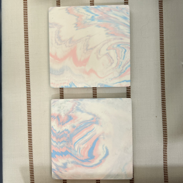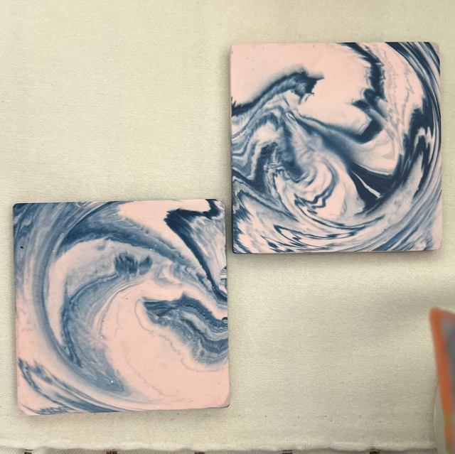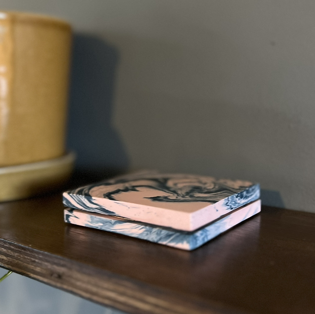 Pink and navy coasters that feel like stone. The perfect dopamine hit for your coffee table. 9cm square with a cork base.
