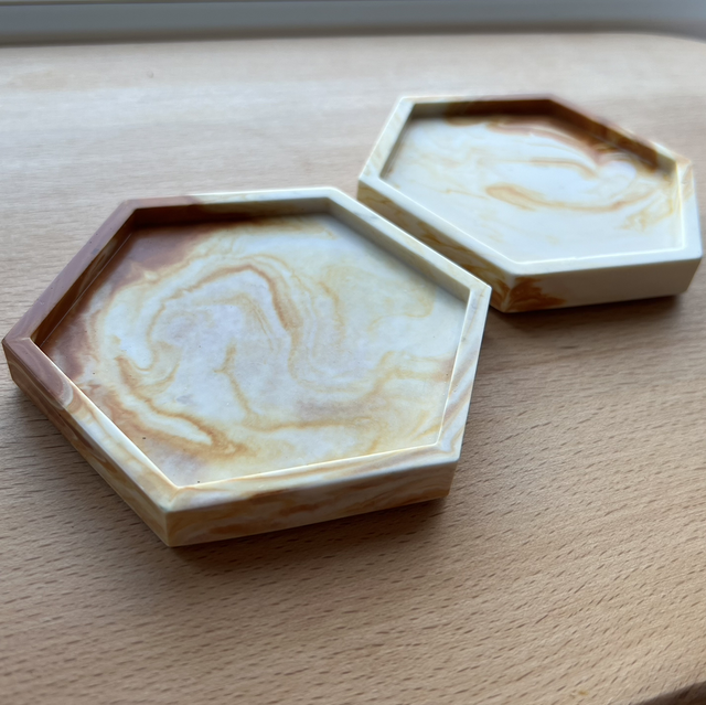 Marbled off white and tan hexagons. Ideal to use as coasters, or as a trinket tray to pop your jewellery or loose change in.