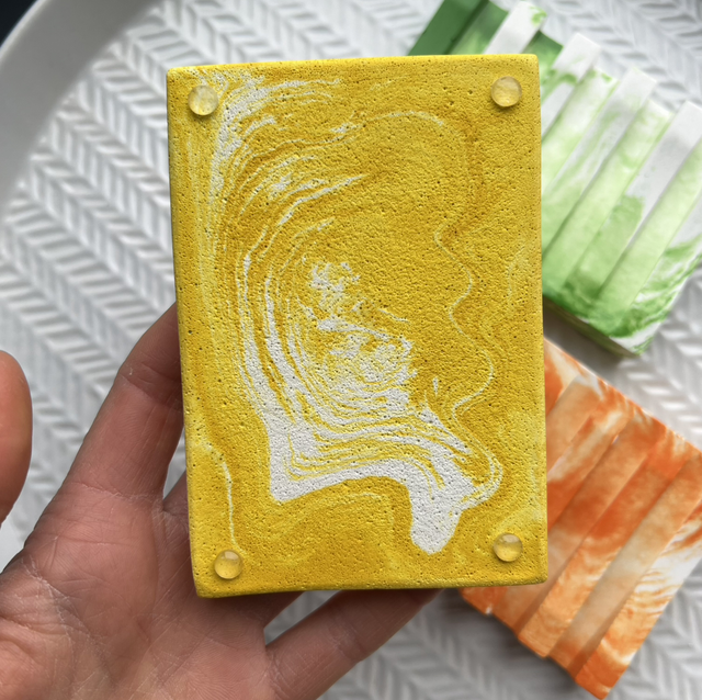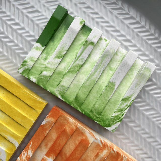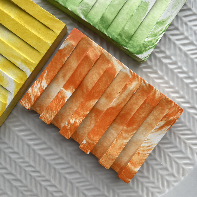 Grooved soap dish in bright colours with white marbling. Beautiful stone finish and the perfect quirky accessory for your bathroom.